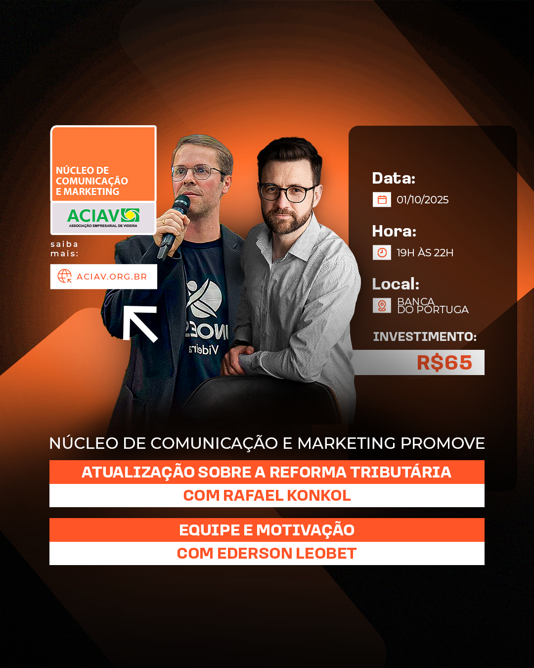 Atividade Núcleo de Comunicação e Marketing Promove Workshop. Com o tema Atualização Sobre a Reforma Tributária com Rafael Konkol. E tema Equipe e Motivação com Ederson Leobet. 01/10/2025 19:00 Banca do Portuga 65,00