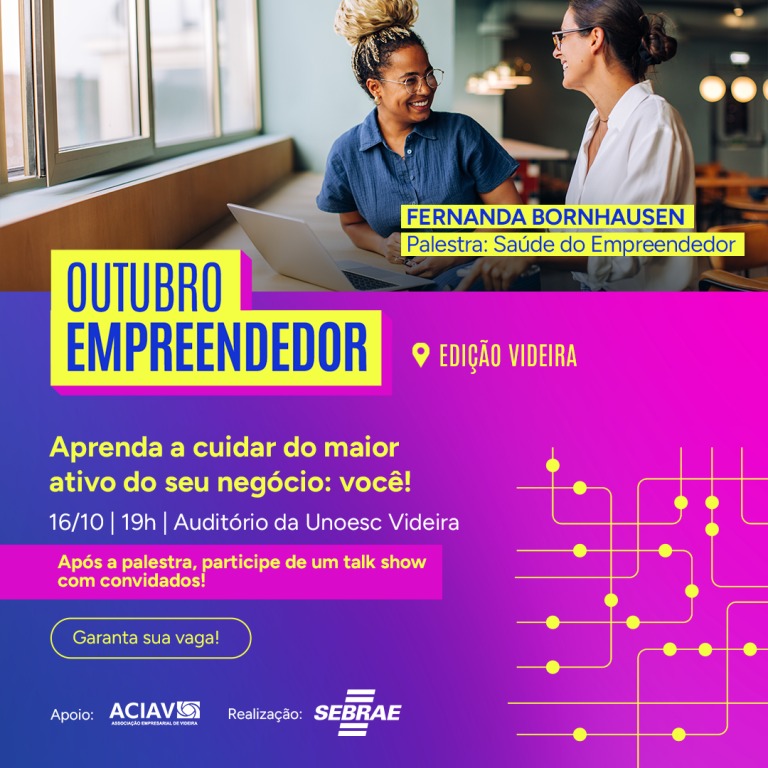 Outubro Mês do Empreendedor Palestra com Fernanda Bornhausen sobre saúde emocional, propósito e bem-estar no contexto. 16/10/2025 18:00 Auditório da Unoesc 40,00