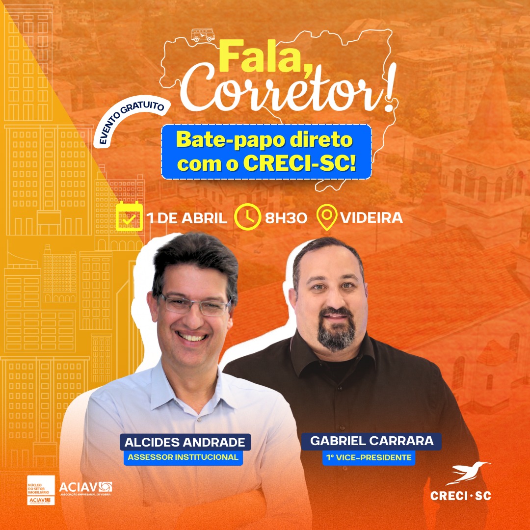 Palestra Núcleo Setor Imobiliário – Palestra Fala corretor – Gabriel Carrara e Alcides Andrade 01/04/2026 08:30 Auditório ACIAV